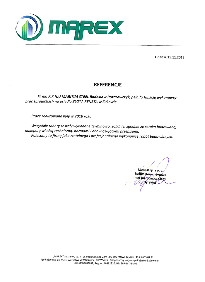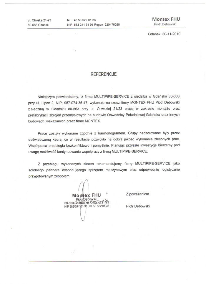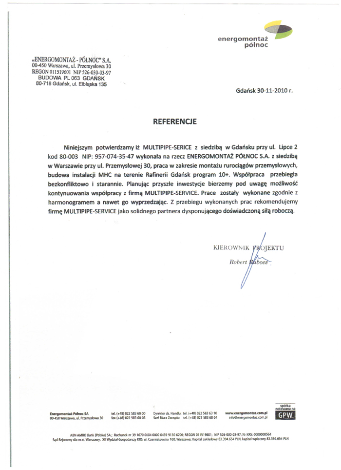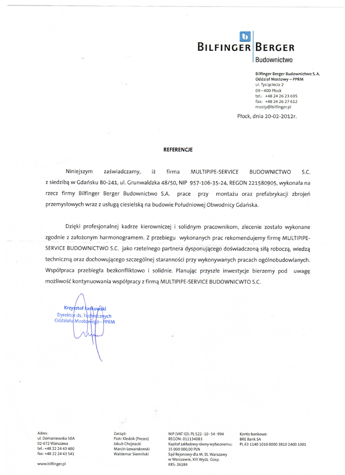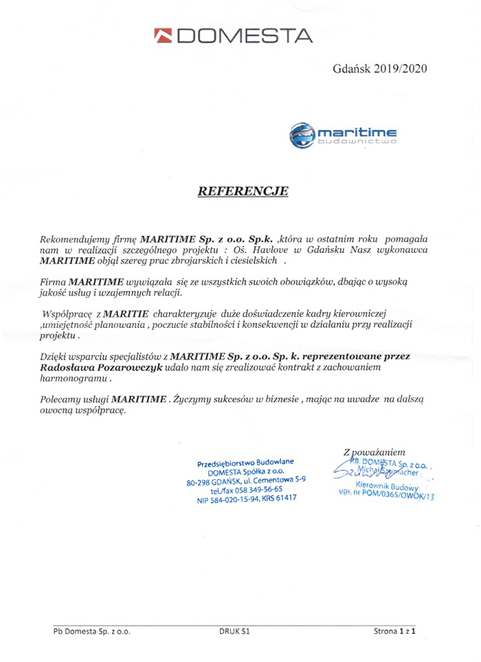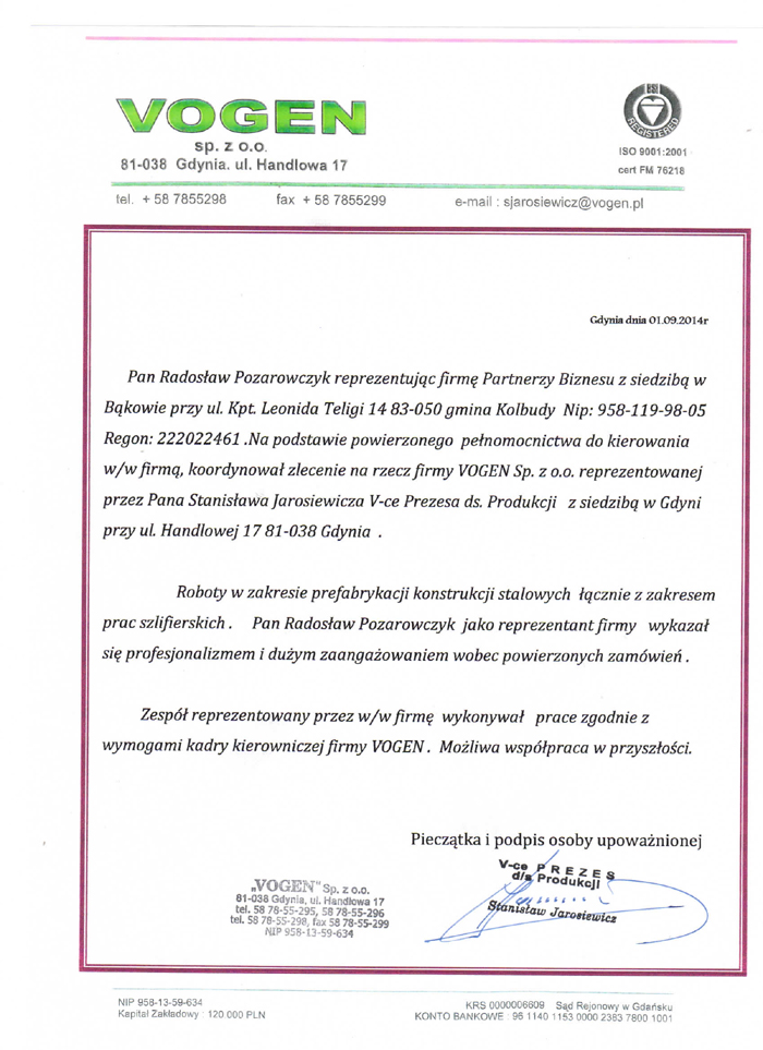 Nasza firma otrzymała szereg pozytywnych akredytacji względem poczynionych działań w obszarze szeroko rozumianego budownictwa oraz sektora stoczniowego. Indywidualne podejście względem każdego klienta oraz zatrudnianych pracowników w strukturze firmy, opiera się na zrozumieniu, wzajemnym szacunku i zapewnieniu wszelkich potrzeb wpisanych w zakres działań naszego przedsiębiorstwa. Dotychczas otrzymaliśmy kredyt zaufania największych kluczowych developerów w Polsce, przede wszystkim na rynku trójmiejskim. Dziękujemy za Państwa poparcie oraz liczne referencje.